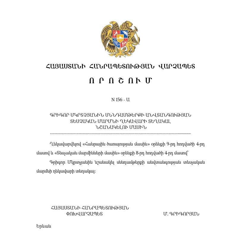 Կիսվել Facebook Telegram Հայաստանի Հանրապետության փոխվարչապետ Մհեր Գրիգորյանի որոշմամբ՝ Գրիգոր Մկրտչյանը նշանակվել է ՀՀ սննդամթերքի անվտանգության տեսչական մարմնի ղեկավարի տեղակալ: