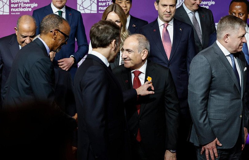 Նկարում Ֆրանսիայի նախագահ Մակրոնն ուսումնասիրում է ՀՀ վարչապետի՝ իրական Հայաստանի քարտեզի տեսքով կրծքանշանը: