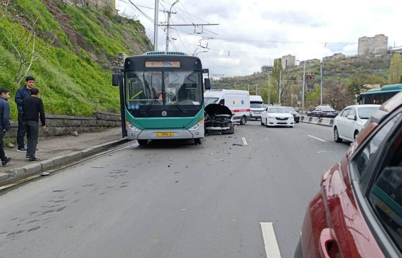 Երևանի Մյասնիկյան պողոտայում «Մերսեդես» մակնիշի ավտոմեքենան հարվածել է թիվ 53 երթուղին սպասարկող կայանված ավտոբուսին:
