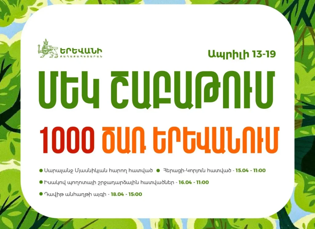 Կիսվել Facebook Telegram Երևանի քաղաքապետարանից հայտնում են, որ մեկ շաբաթում 1000 հասուն ծառ կտնկվի Երևանում։ «Դուք ևս կարող եք միանալ ծառատունկին. 15.04, 11:00-Հերացի-Կորյուն հատված16.04, 11:00- Իսակով պողոտայի շրջադարձային հատվածներ18.04, 15:00-Դավիթ անհաղթի այգի»։